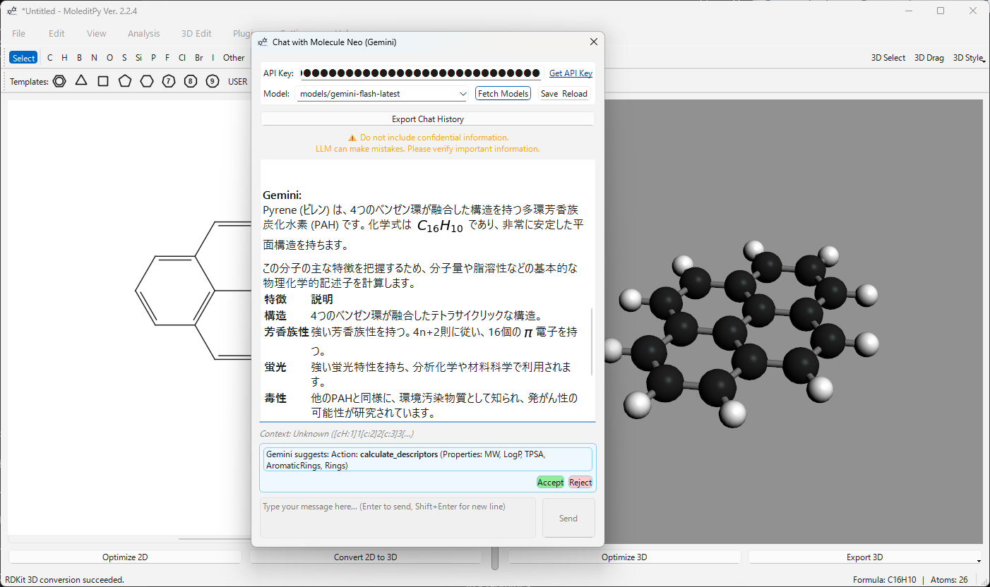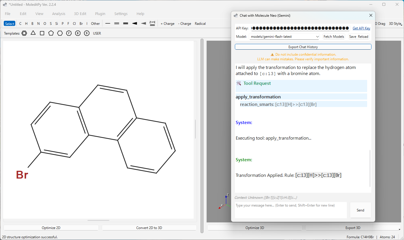 main_window.data.atomsfor structural changes or selection updates. - Context Injection: Automatically constructs a system context including the current molecule’s SMILES, InChIKey (resolved via PubChem), and specific atom selection indices.