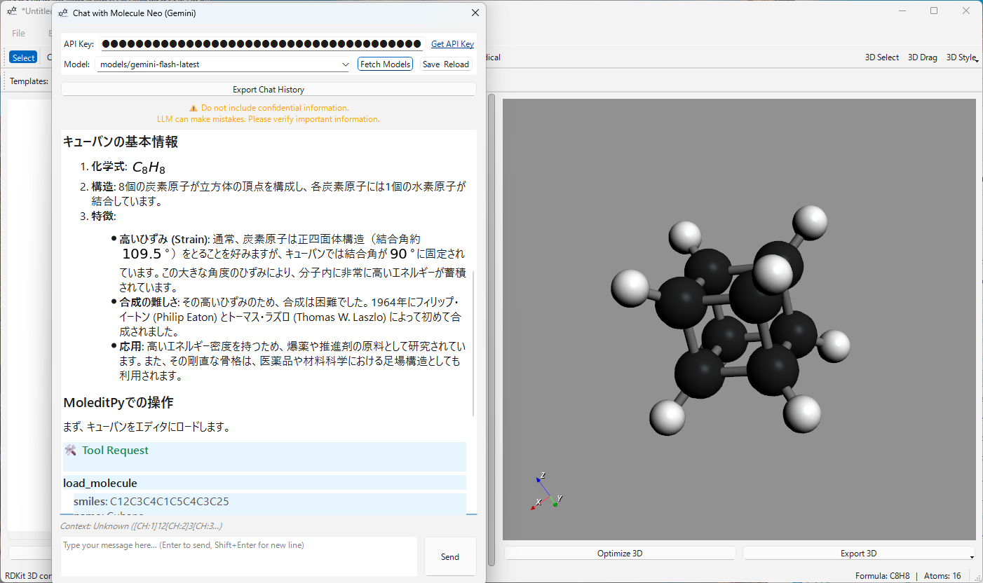 User: “Load Caffeine” or “アスピリンをロードして” AI: Searches PubChem, retrieves the SMILES, and loads the structure into the editor.