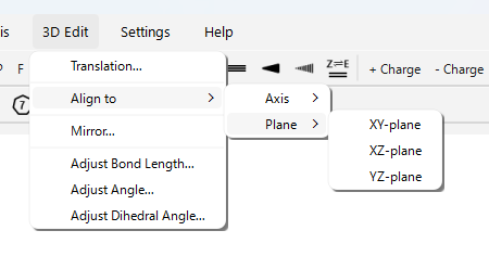 - 3D 編集: 分子全体の平行移動、選択原子の平面化、特定軸への整列、結合長・角度・二面角の調整、鏡像作成。
