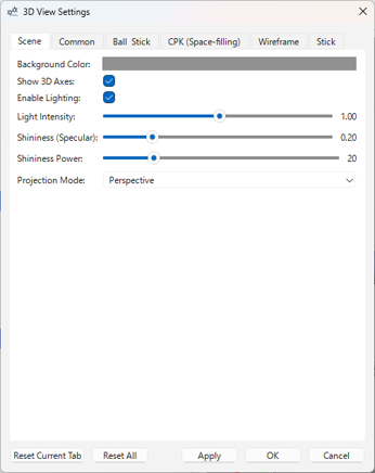 - 各表示スタイル (Ball & Stick, CPK, Wireframe, Stick) タブ: