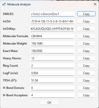 - 分子分析: SMILES, InChI, 分子式, 分子量, LogP, TPSA などの基本的な分子特性を表示。