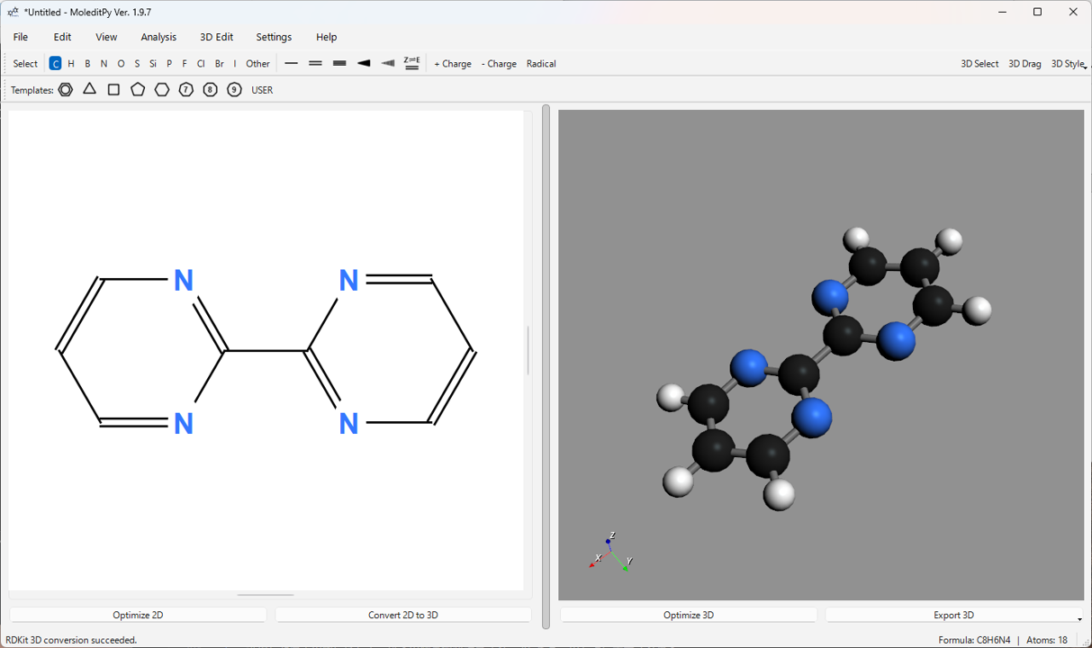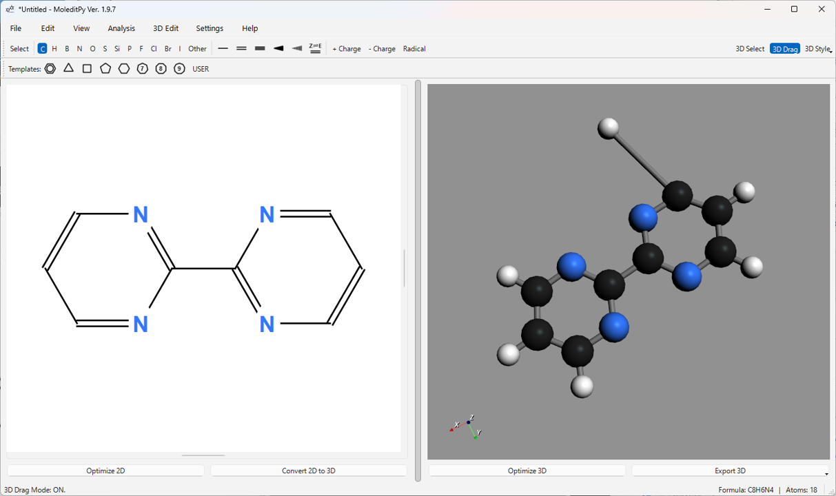 MoleditPy は、Python で開発された分子編集ソフトウェアです。直感的なインターフェースを通じて、2D での分子構造の描画・編集、および 3D 構造の生成・表示・簡単な編集を行うことができます。