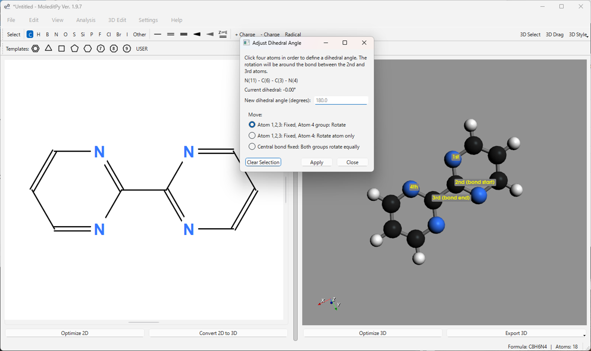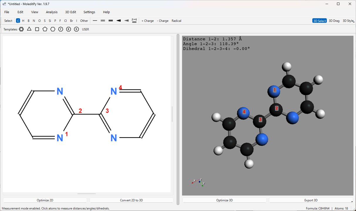 - 3D 測定: 3D ビュー上で原子間の距離、3 原子間の角度、4 原子間の二面角を測定。