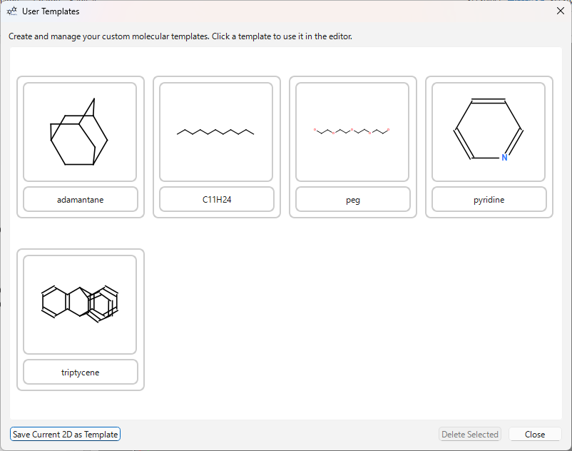 - 2D 分子編集: 原子や結合の追加・削除・変更、テンプレートを用いた構造作成。ユーザーが指定した構造を保存・利用できるユーザーテンプレートにも対応しています。